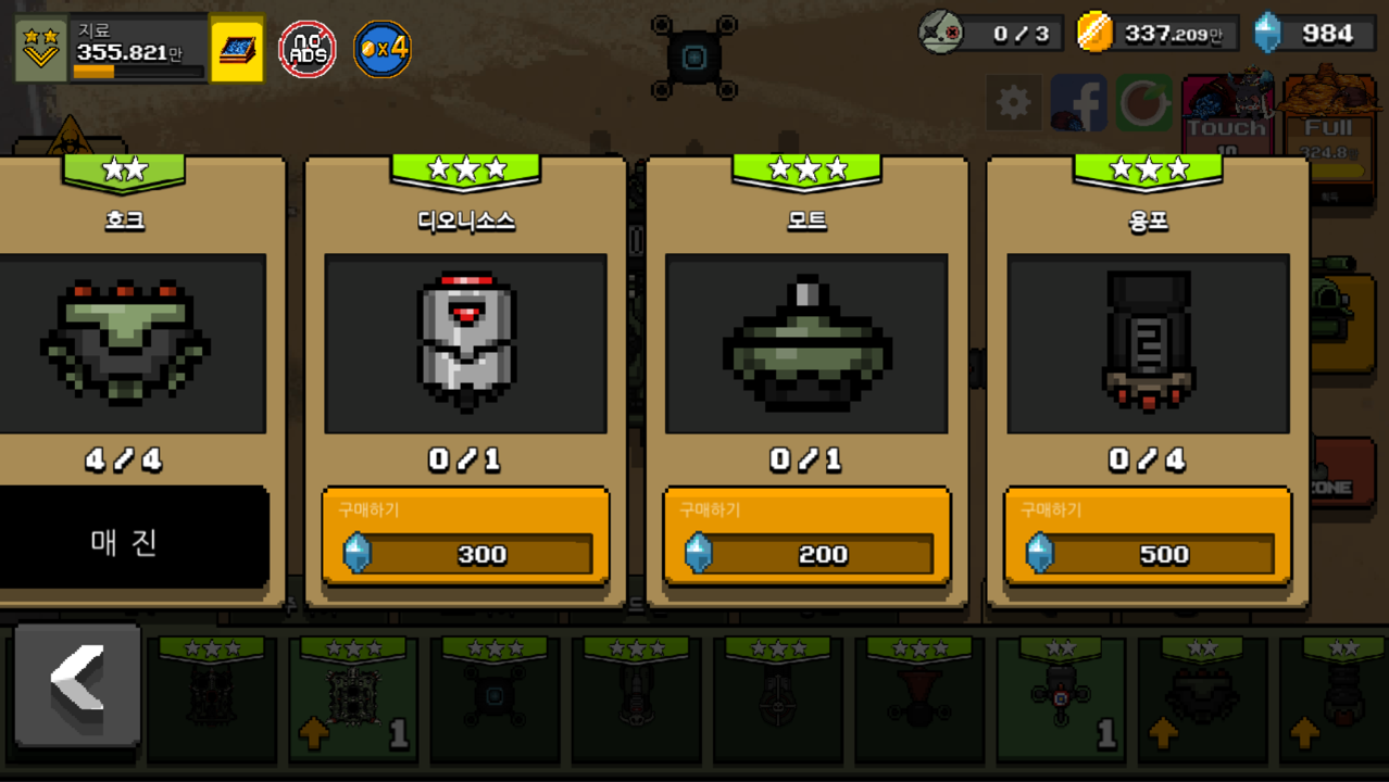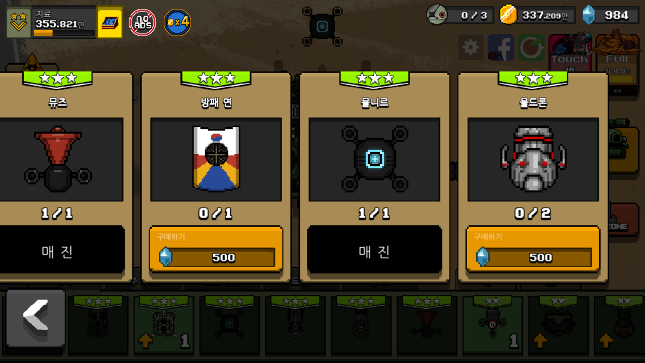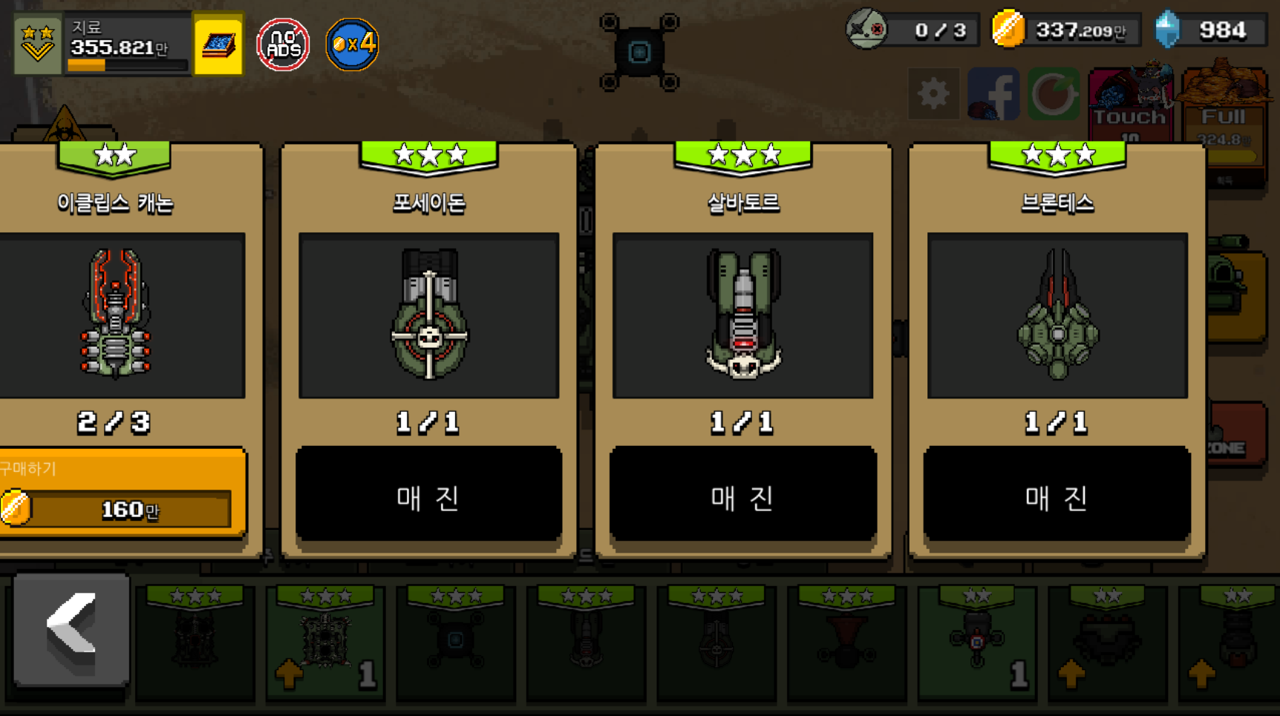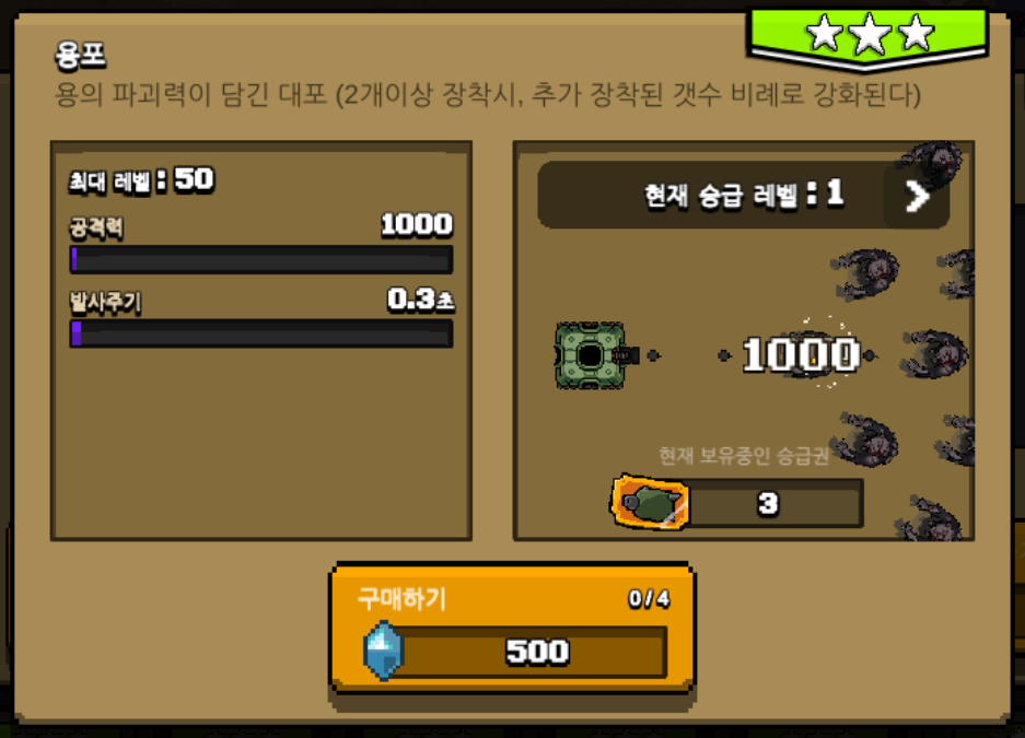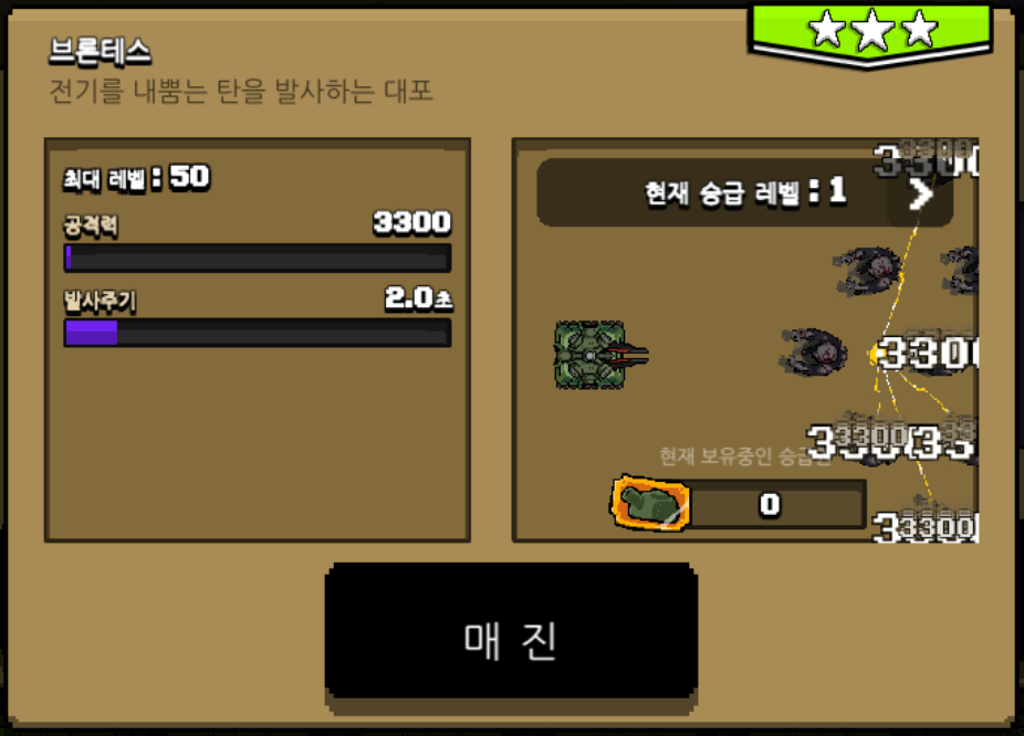 제가 마지막으로 구매했던 무기는 별 3개인 포세이돈, 살바토르를 사용하고 있었는데 이번에는 브론테스라는 주무기가 새롭게 나왔습니다. 이전의 무기들과 똑같이 3성으로 전기를 내뿜는 탄을 발사하는 대포입니다. 공격하는 이펙트만 봐도 구매욕구가 엄청나게 샘솟는데 공격력도 무려 3000, 발사 주기 2초로 주무기로 손색이 없는 스펙을 가지고 있습니다.