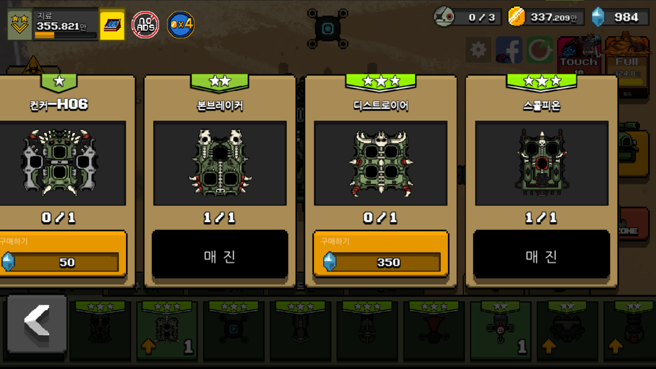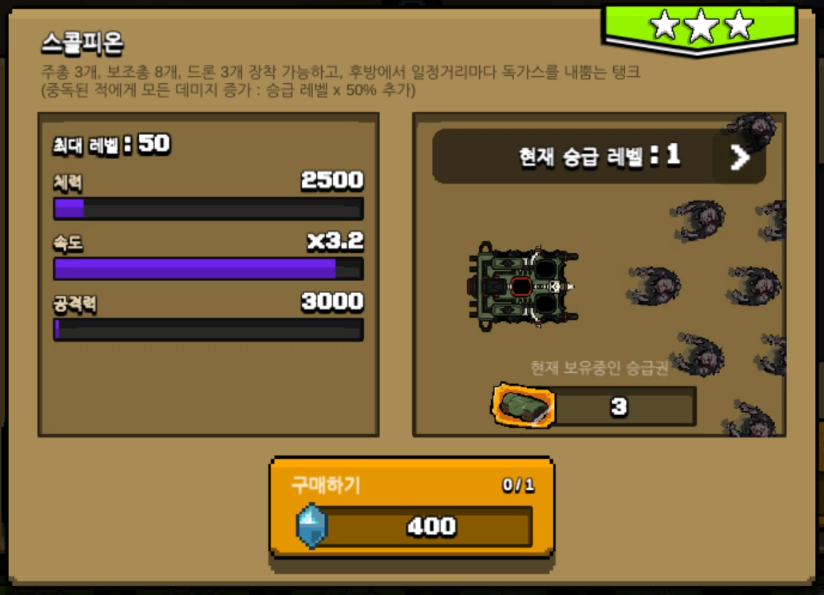 마지막 최강 조합의 핵심은 본체의 스콜피온입니다. 보석 400개가 필요한 녀석으로 주총 3개, 보조총 8개, 드론 3개 장착 가능하며 가장 핵심이 되는 독가스를 내뿜는 탱크 자체에 공격력이 붙어있습니다. 게다가 중독된 적에게 모든 대미지라는 엄청난 능력도 가지고 있기 때문에 현 상점에서 구매할 수 있는 최고의 탱크라고 생각합니다.