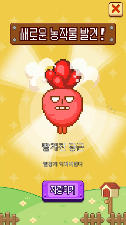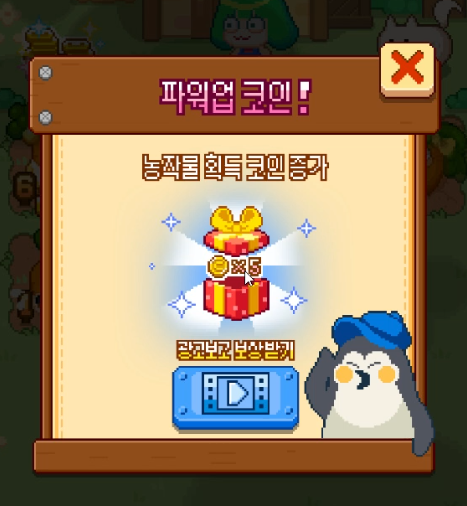 게임 중간중간 펭귄이 날라가는데 이 녀석을 클릭하면 광고를 통해 농작물 획득 코인 증가 버프를 받을 수 있습니다. 일정 시간동안 지속되는 이 버프는 무려 농작물이 얻는 골드의 5배의 효과를 볼 수 있기 때문에 보일 때마다 봐주시면 빠르게 골드를 모으실 수 있습니다.