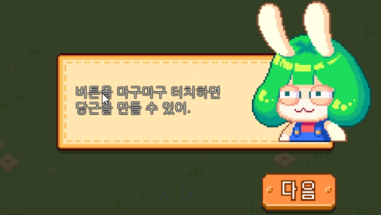 요즘 인기 있는 모바일 게임 바로 무한의 농장 리뷰 시작해보겠습니다. 게임을 시작하면 초록머리의 귀여운 토끼가 나와서 버튼을 마구마구 터치해 당근을 만들라고 합니다.