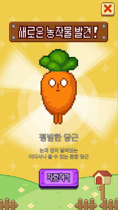 아래에 있는 당근을 마구마구 터치해주면 땅을 열심히 파서 당근을 만들어냅니다. 만든 당근은 레벨에 따라서 외형과 이름이 달라지고 얻게 되는 골드도 달라집니다. 처음 얻게 되는 당근은 눈과 입이 달려있는 어디서나 볼 수 있는 흔한 당근인 평범한 당근이 나옵니다. 눈코입 정도는 달려있어야 평범한 당근이죠.