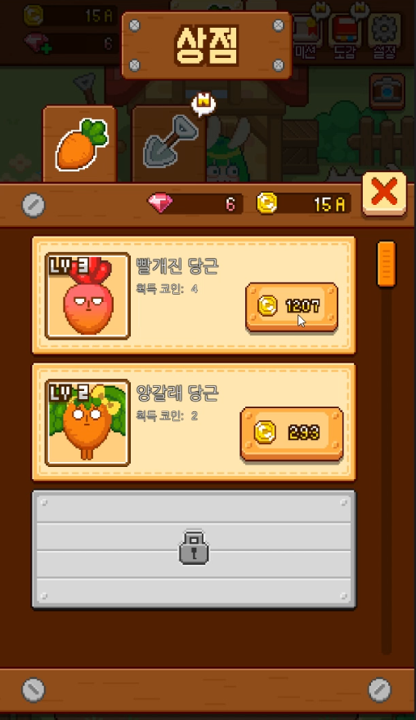 마지막으로 상점에서는 보석 또는 돈으로 당근을 구매할 수 있는데 구매하면 할수록 더비싸지니까 초반에 조금 이용해주고 딱히 손대지 않아도 됩니다.