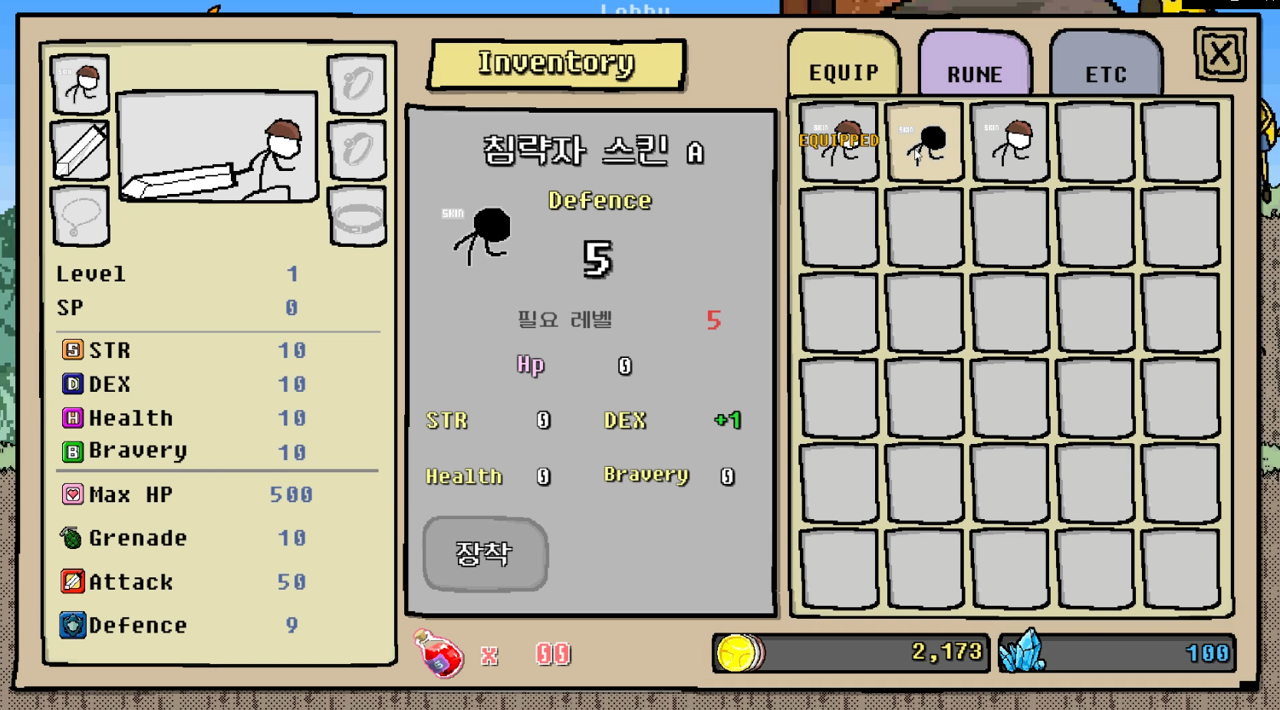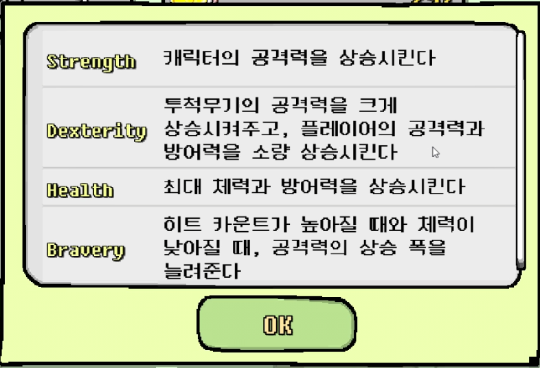 스텟은 총 4가지로 힘, 덱스, 체력, 버서커?입니다. 각 스텟의 능력 상승은 이러합니다.