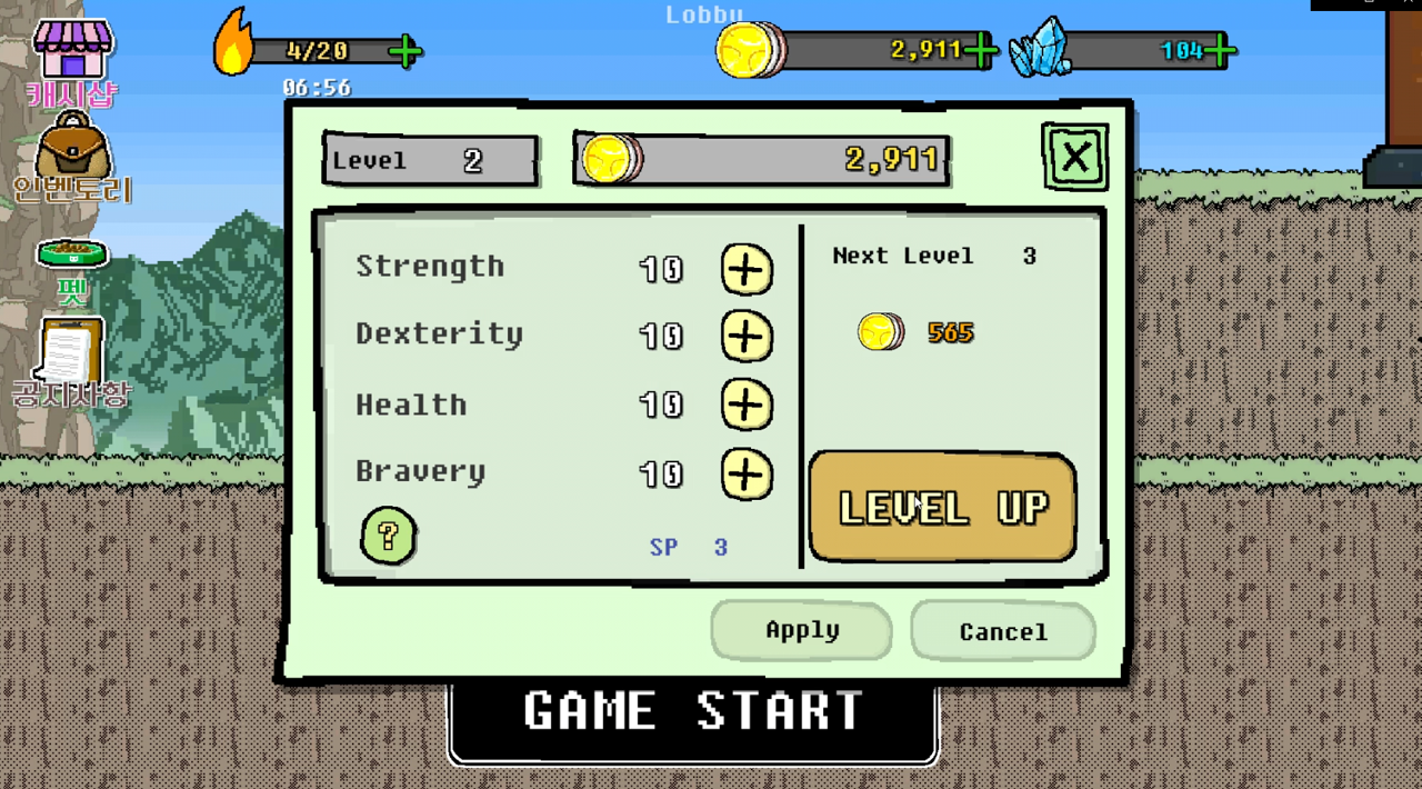 장비와 함께 캐릭터를 강하게 만들 수 있는 스텟이 존재합니다. 처음 하시는 분들은 레벨이 안 오르는 것에 대해 당황하실 수 있는데 레벨은 게임 플레이를 통해 올리는 것이 아닌 마을의 구름 타고 있는 NPC를 통해 돈을 주고 레벨업을 하실 수 있습니다.