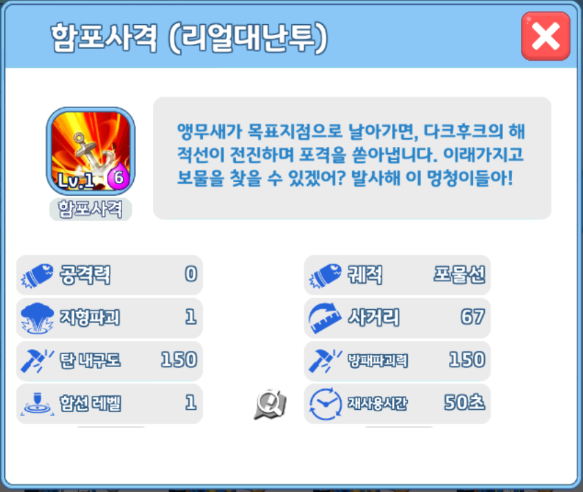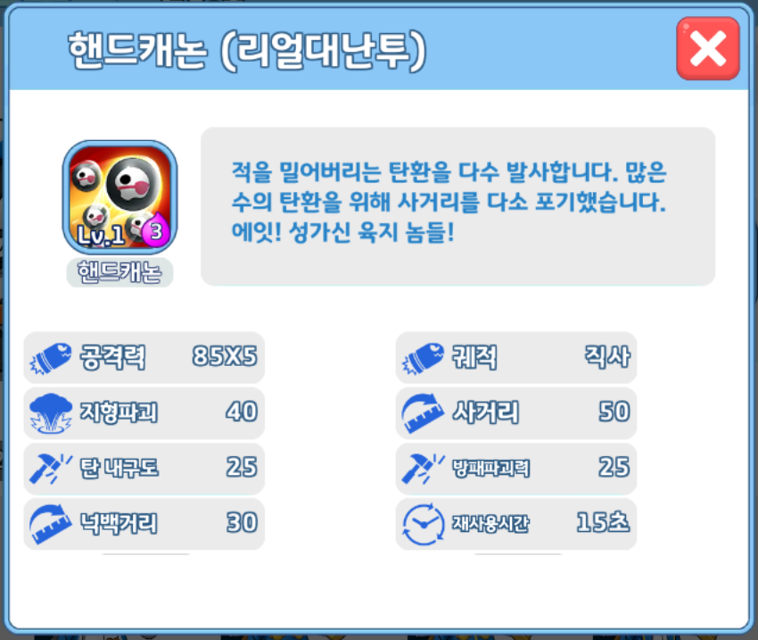 적을 밀어버리는 탄환을 발사한다고 하는데 대부분의 플레이어들이 이 스킬을 사용하는 모습은 잘 못 본 것 같네요. 아무래도 사거리가 50으로 굉장히 짧아서 그런 듯합니다.