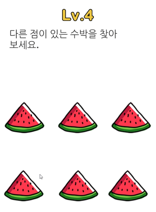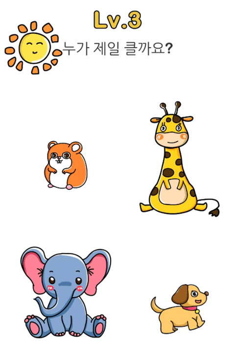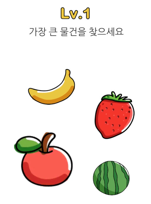 첫 번째 문제부터 피식하게 만듭니다. 가장 큰 물건을 찾으라는데 지금 보이는 크기로만 봤을 때는 사과이지만 상식적으로 큰 물건은 수박입니다. 네 맞습니다. 첫판부터 장난질이죠.