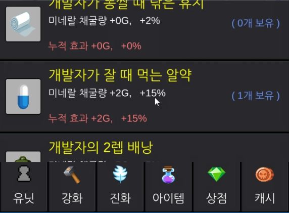 보석으로 아이템을 뽑을 수 있는데 여러 게임들에 있는 유물과 비슷하게 다양한 옵션들을 올려줍니다. 미네랄 채굴량부터 다이아 채굴량까지 게임을 진행할수록 더 많은 양의 미네랄을 채굴할 수 있게 해주는 1등 공신입니다.