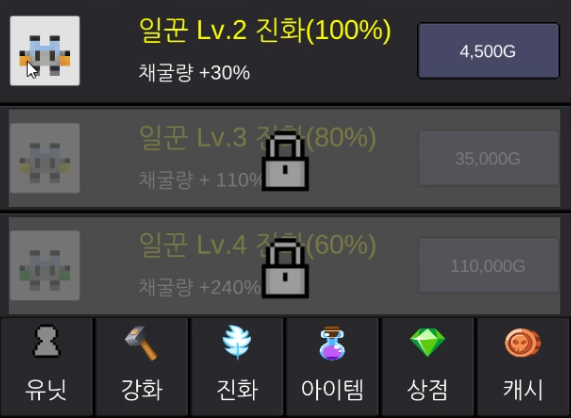 진화 탭에서는 비용을 내고 일정 성공 확률로 진화를 할 수 있는데 채굴량이 많이 늘어나기 때문에 초반 굉장히 중요한 기능입니다.