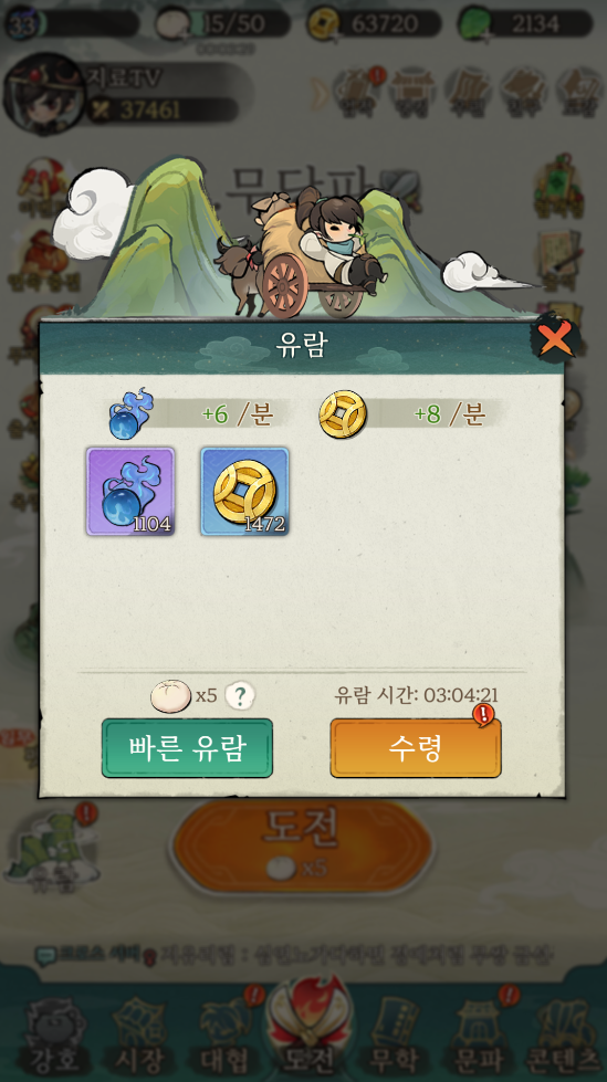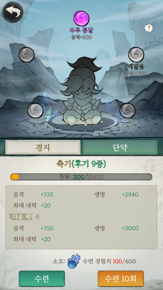 초반에는 어려워도 꼭 해줘야 하는 것이 있습니다. 바로 경지 수련인데요. 수련 경험치를 소모해서 수련을 해주면 경지가 올라가게 됩니다. 수련 경험치를 얻는 방법은 유람에서 자동보상과 빠른 유람을 통해 얻으실 수 있습니다.