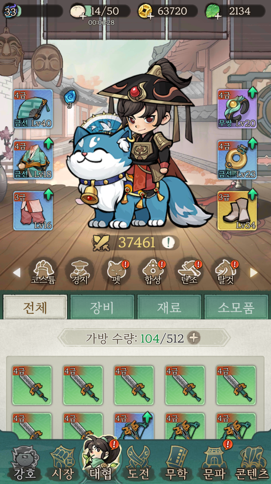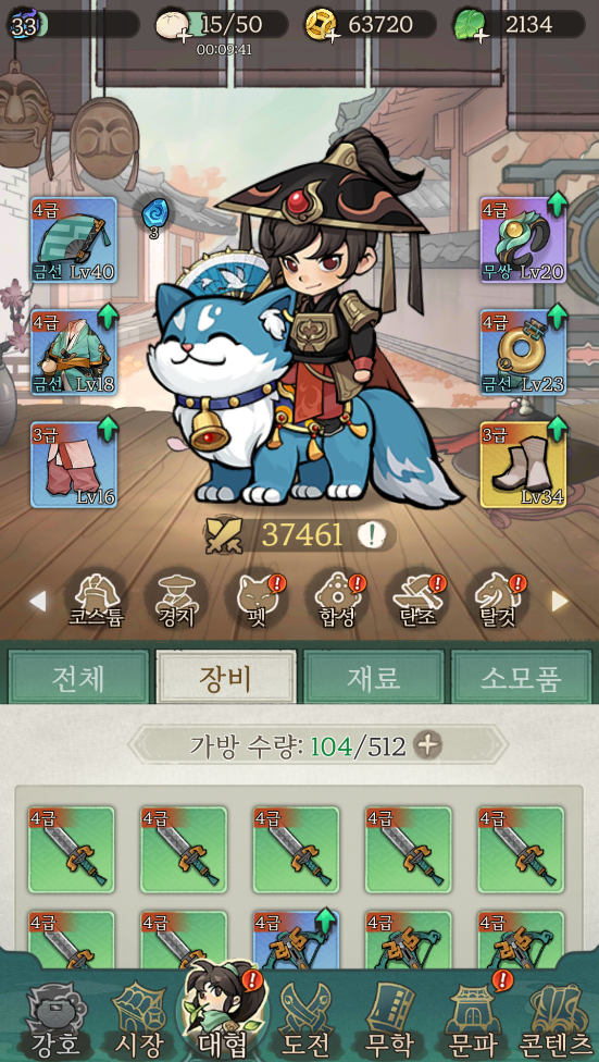 만두를 사용해서 갈수있는 최대한 높은 스테이지까지 클리어 해주세요. 그러다 막히는 구간이 생기면 빠른 유람을 사용해서 만두를 모두 소모해줍시다. 그렇게 얻은 수련 경험치와 돈으로 경지를 올려주고 장비 레벨을 올려주면 됩니다.