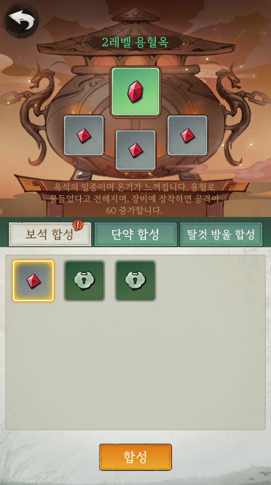 펫 옆에 있는 합성을 통해 보석을 합성해줄 수 있습니다. 이 보석은 장비에다가 장착 시켜줄 수 있습니다. 하지만 초반에는 보석이 그리 많지 않더라구요. 그래서 우선 합성하지 않은 상태로 전부 장착한다음 남는다 싶을때 합성해서 바꿔 끼워주는 방식으로 전투력을 높여줍시다.