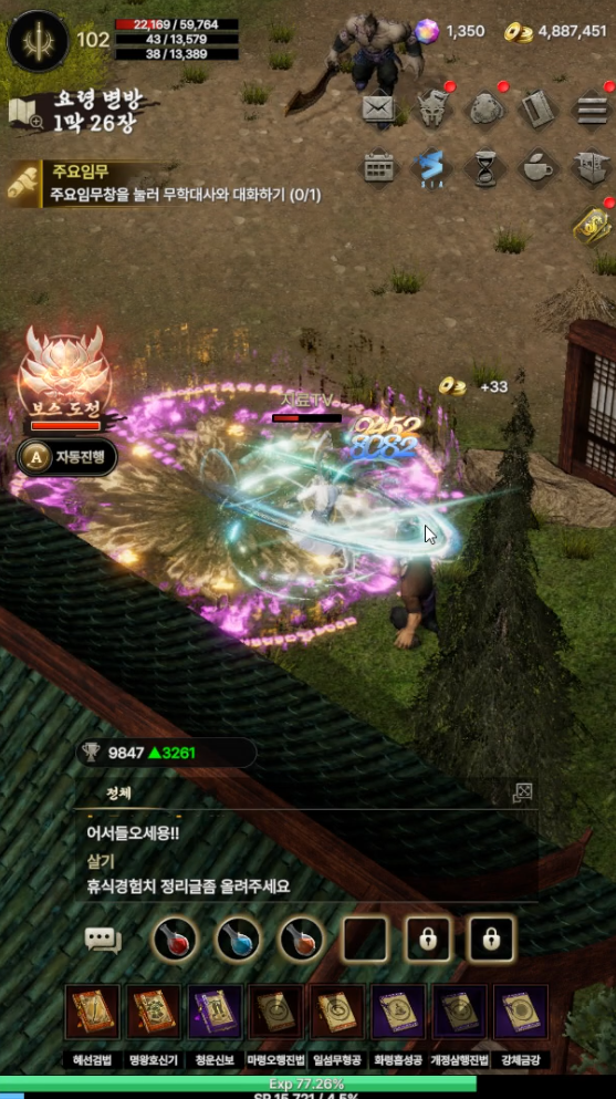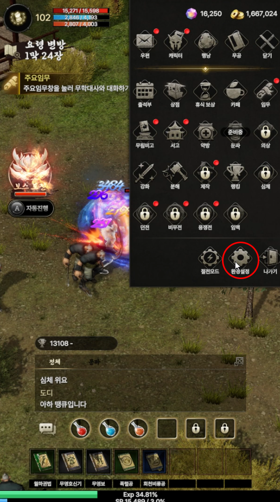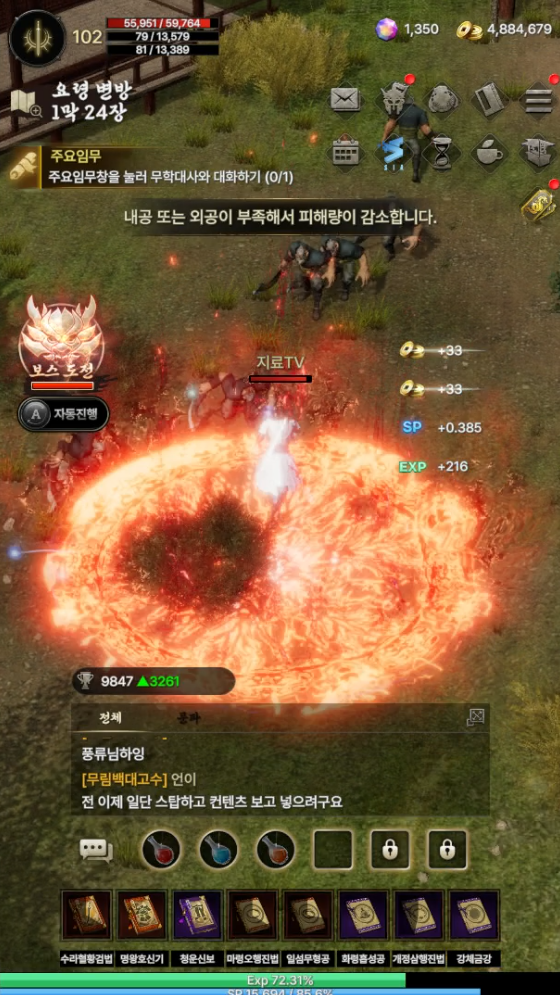 이렇게 초절정 무공서를 장착하고 전투를 나가보면 완전히 달라진 모습을 볼 수 있습니다. 이펙트도 엄청 화려해졌죠?
