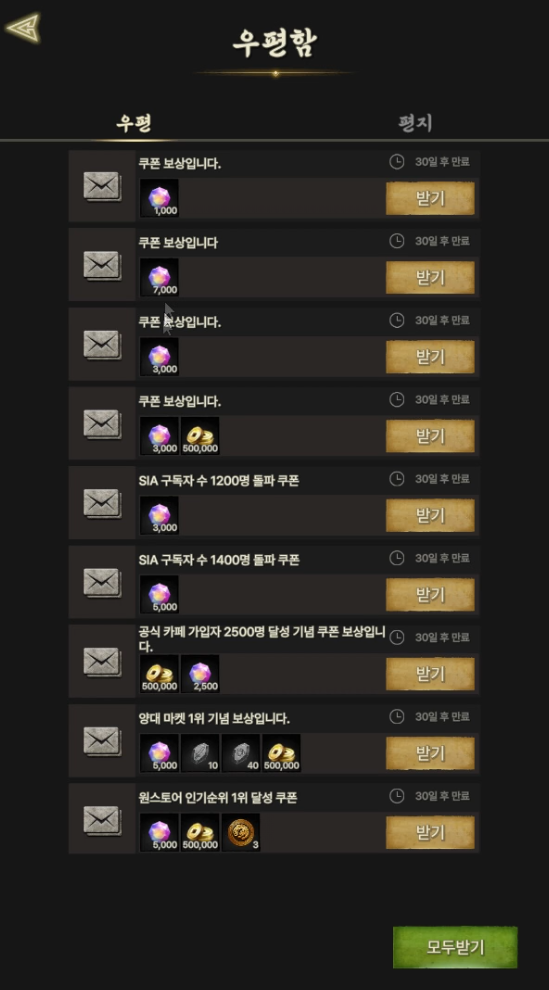 그런다음 계정 쪽으로 가면 쿠폰코드 입력하는 곳이 나옵니다. 전부 입력해주면 우편함으로 보상이 와있을겁니다. 보시는 바와 같이 엄청난 양의 보석을 받을 수 있기 때문에 필수적으로 진행해주세요.