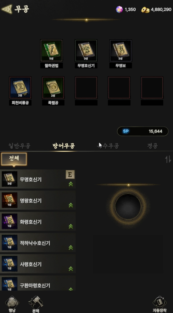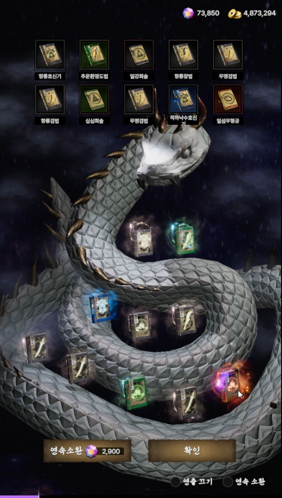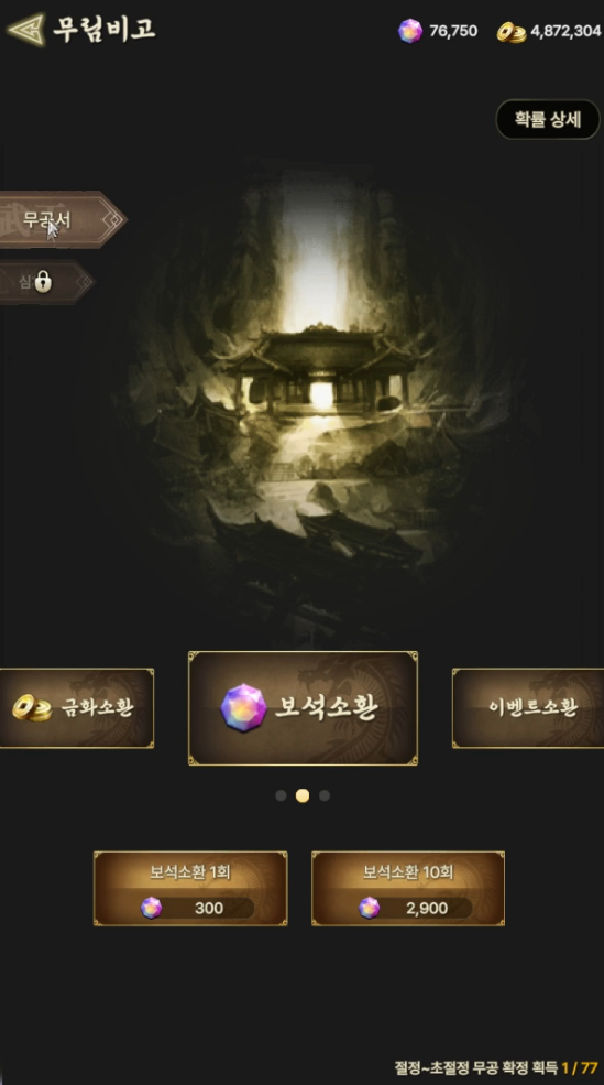 이렇게 얻은 보석을 전부 무공서 뽑기에 사용해봤습니다. 전설 무공서가 그렇게 잘 나오지는 않지만 대량의 보석을 사용하기 때문에 어느정도 얻을 수 있더라구요.