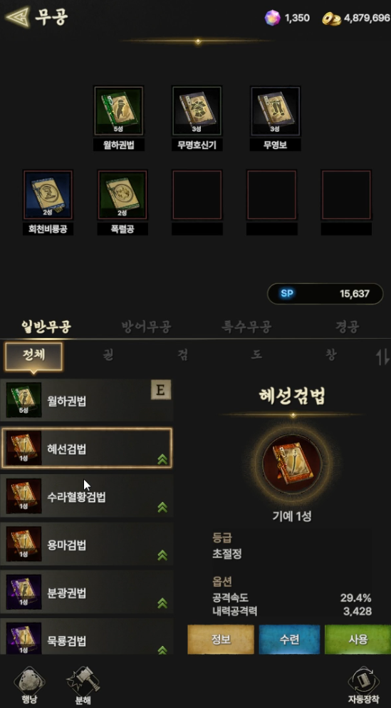 일반무공에서 초절정 무공서 3개 (혜선검법, 수라혈황검법, 용마검법), 방어무공에서도 명왕호신기가 나왔습니다.