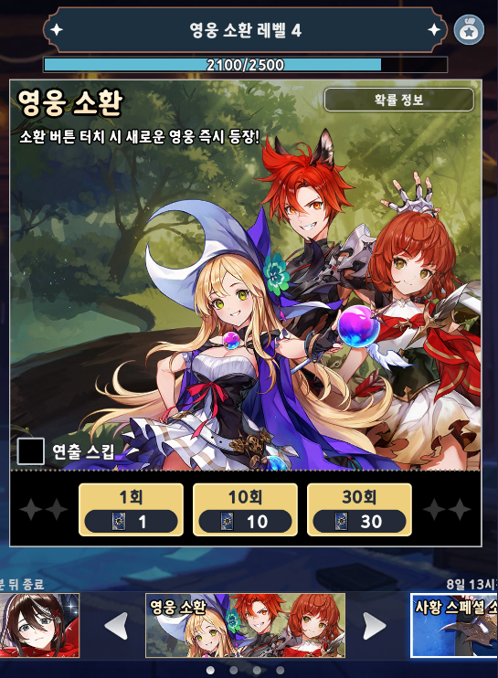 초반에 얻게 되는 루비는 무조건 영웅 소환에 전부 사용해줍시다. 그 이유는 이 게임에서 영웅은 많이 얻으면 얻을수록 좋기 때문입니다. 또한 얼마나 빠르게 소환레벨 5을 달성하는지가 중요하거든요.