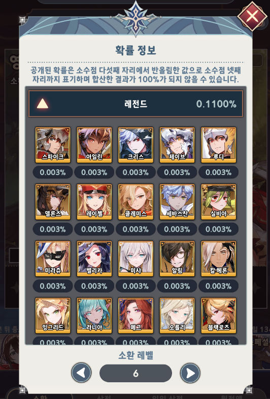 우선 소환레벨 5부터 레전드 영웅이 나오는데요. 레전드라고 다 좋지는 않지만 도감 역할이나 버프용으로 사용되는 캐릭터들이 많고, 주력 딜러와 탱커들도 등장하기 때문에 아주 중요합니다.