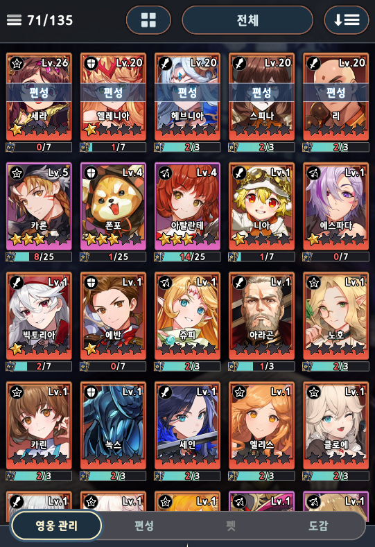 그리고 스테이지 26부터 슬롯이 하나 더 오픈되면서 5명의 캐릭터를 편성할 수 있습니다. 이때 본격적인 덱 세팅을 해줘야 하는데 이땔 대비해서 최대한 다양하고 많은 캐릭터들을 뽑아 놓아야 합니다. 그래야 편하게 앞으로의 진로를 정하실 수 있거든요.