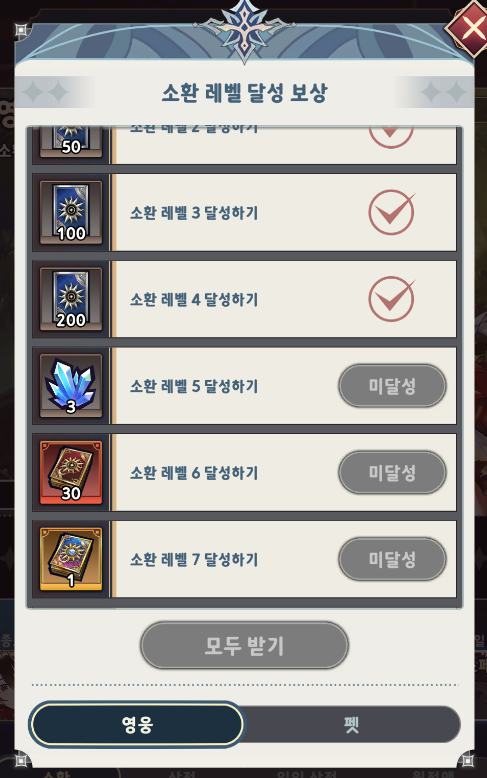 또한 소환레벨 옆에 있는 주머니를 눌러서 레벨 달성 보상들도 얻어줄 수 있습니다.