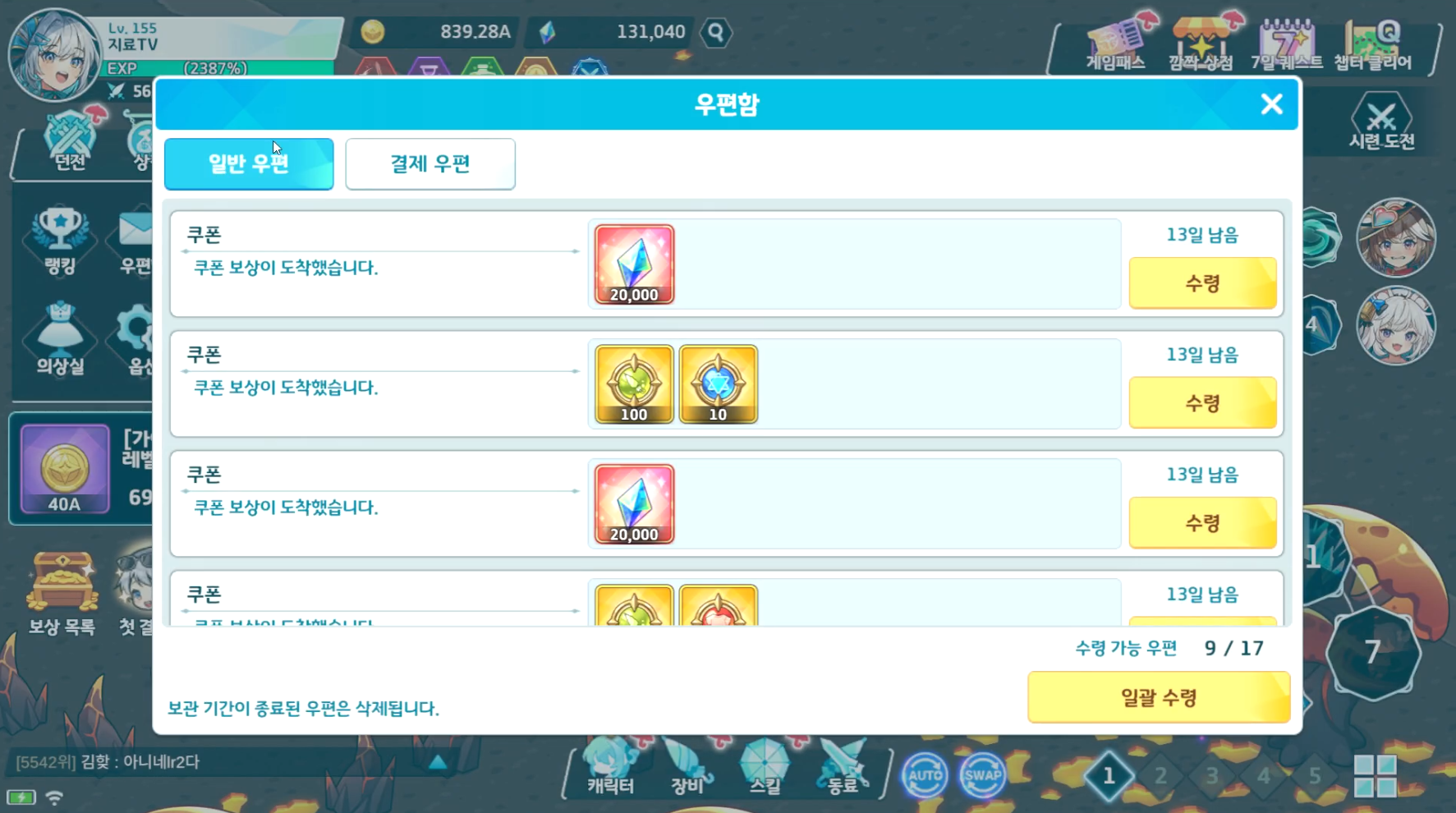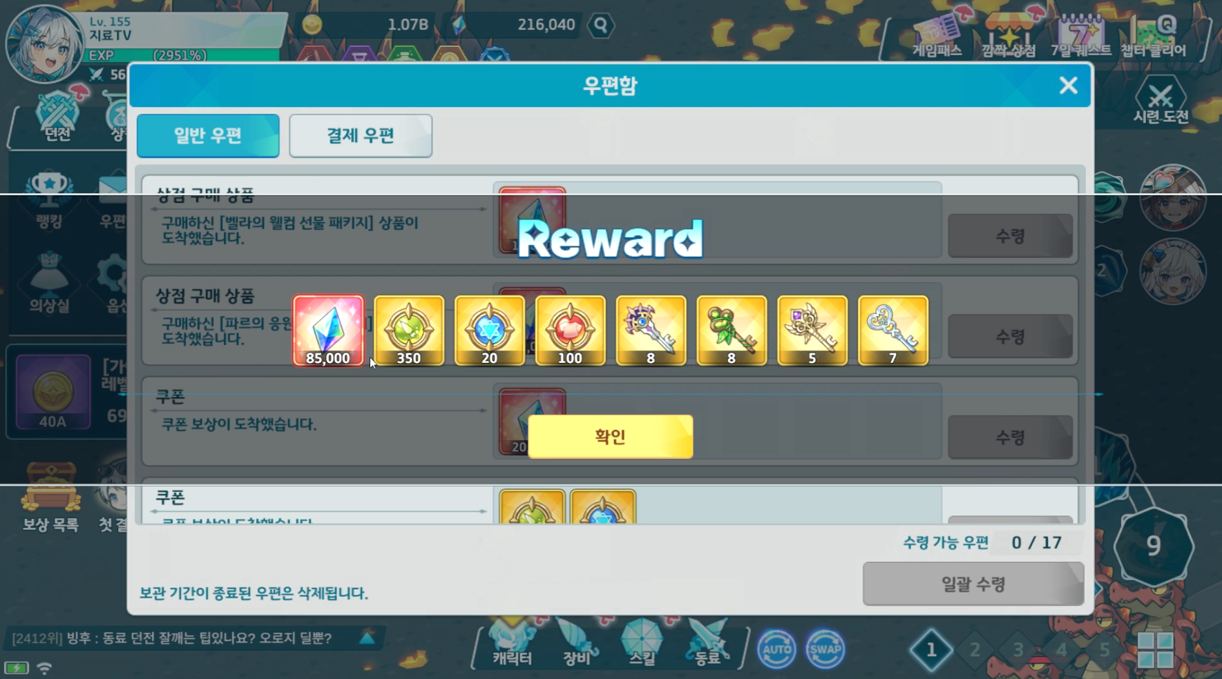 이렇게 사용한 상품들은 우편함에서 확인 하실 수 있는데요. 보상을 전부 일괄수령 해주면 상당히 큰 보상을 얻으실 수 있습니다.