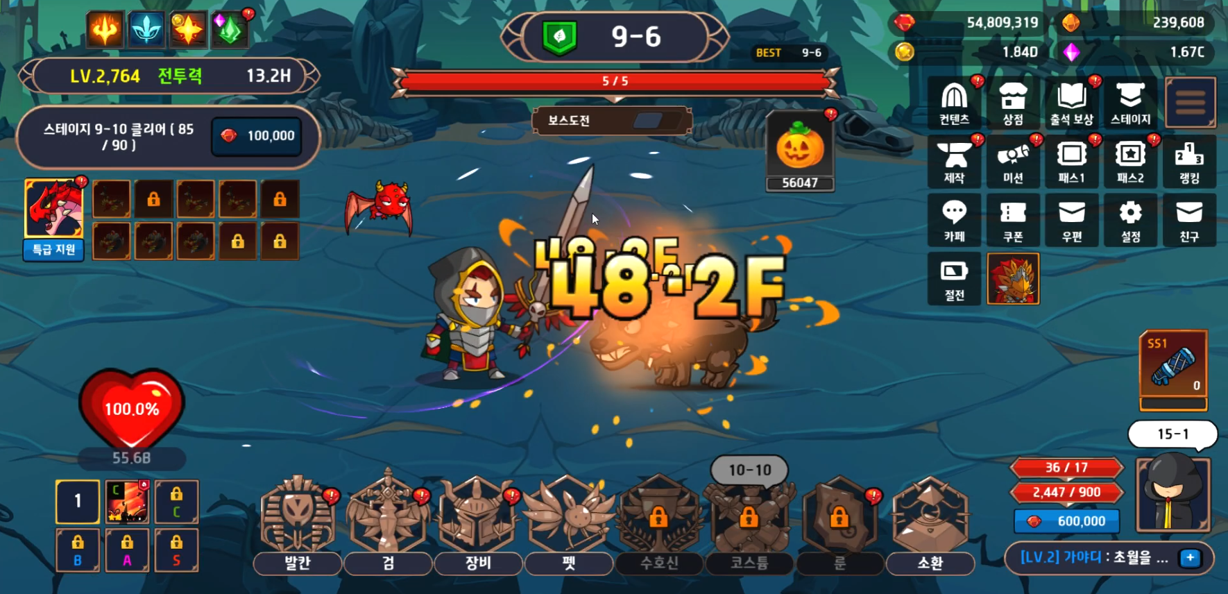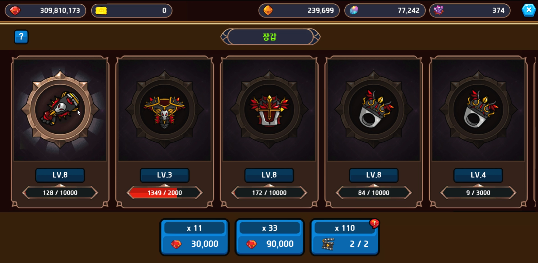 장비는 장갑, 투구, 금화반지를 우선적으로 뽑아주면 좋습니다.