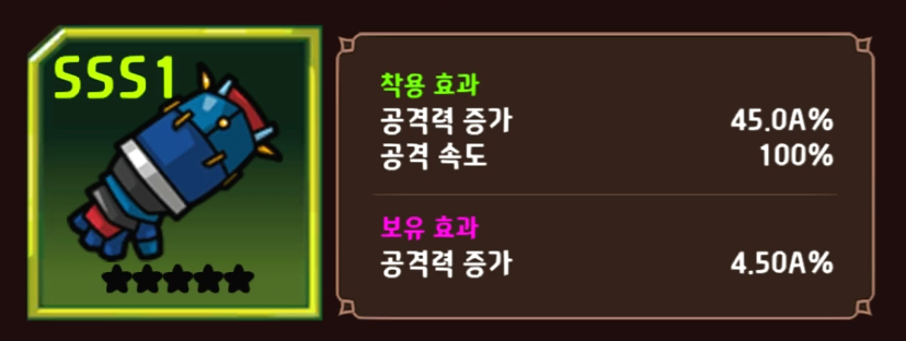 장갑의 경우는 공격력과 공격속도를 올려주기 때문에 매우 중요합니다. 그래서 이번에 10레벨까지 뽑았더니 SSS장갑을 얻을 수 있었습니다.