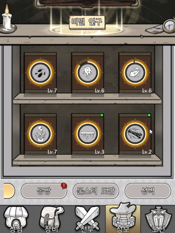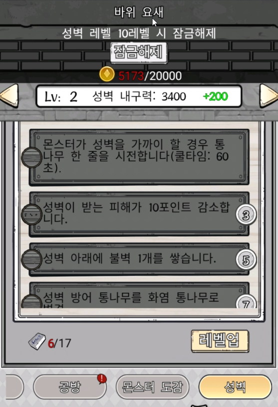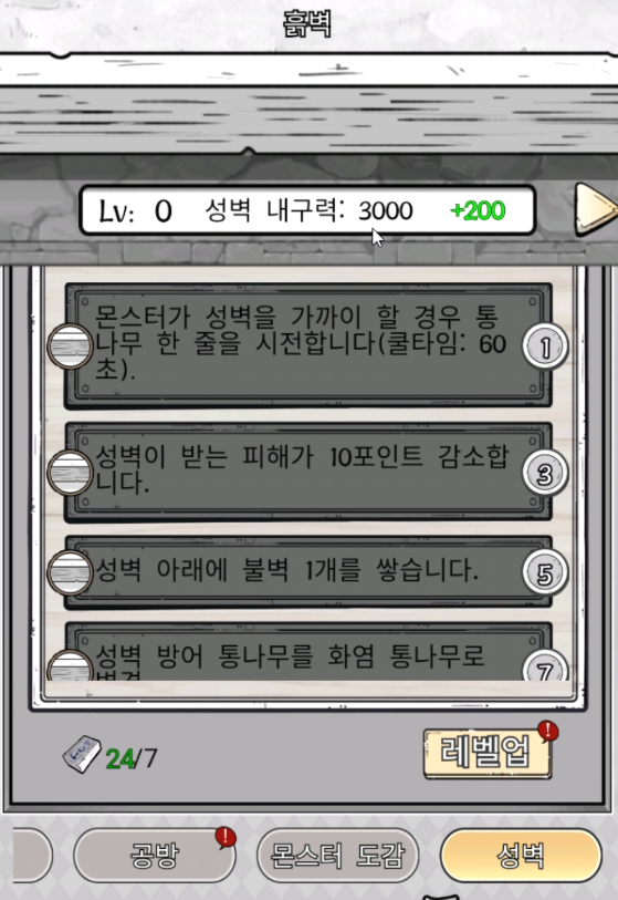 이렇게 강화시키면 나중에는 더 강한 벽으로도 업그레이드 시킬 수 있습니다. 성벽 레벨업에 필요한 룬 초석을 얻는 방법은 도전모드를 클리어하는겁니다.