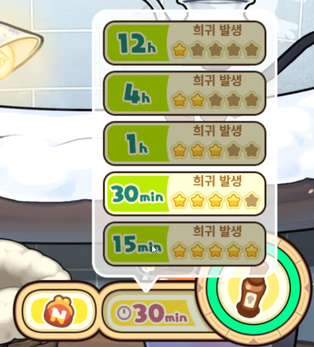 시간 설정에 따라 희귀 발생 등급이 달라지게 됩니다. 12시간으로 세팅하면 별 하나짜리만 등장하고 시간이 짧아질수록 더 높은 등급이 나올 확률이 생기게됩니다. 하지만 내 설비개발로 얻을 수 있는 등급 이상은 나오지 않기 때문에 초반엔 굳이 15분 세팅할 필요는 없습니다.