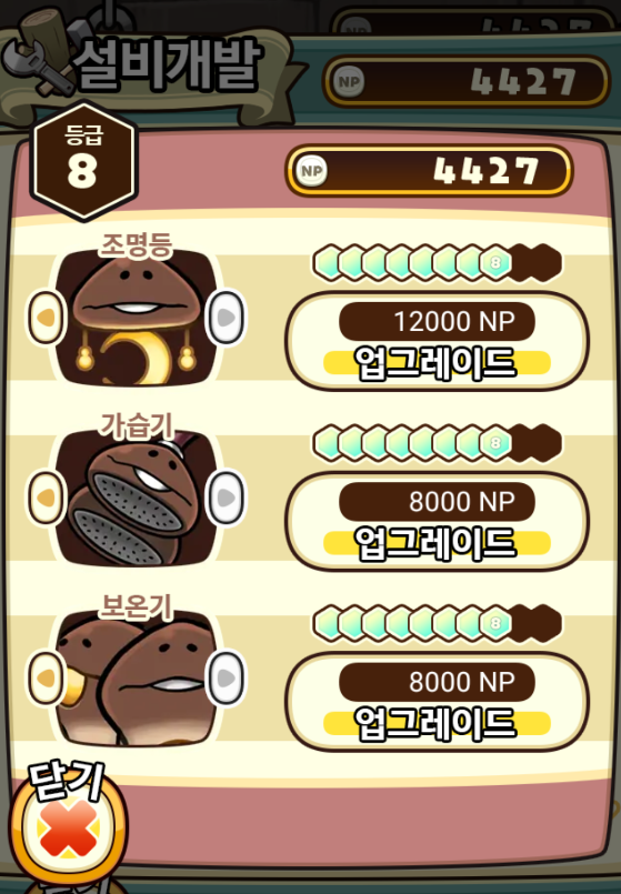 얻은 NP를 이용해 설비들을 업그레이드 해줘야 더 빠르게 희귀 등급의 나메코를 얻을 수 있습니다. 희귀한 등급일수록 더 비싸게 판매할 수 있거든요.