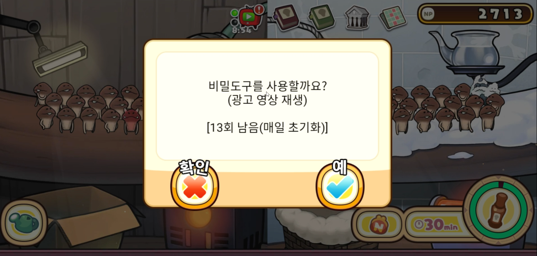 상단에 있는 TV아이콘을 누르면 비밀도구가 등장합니다. 이걸 사용하면 모든 재배키트에 나메코들이 전부 자라나게 됩니다. 하루에 14회 사용가능하고 매일 초기화됩니다. 나온 나메코를 전부 재배해 NP를 벌어줍시다.