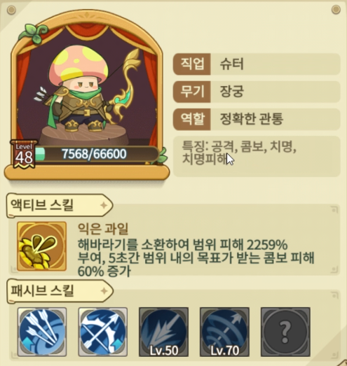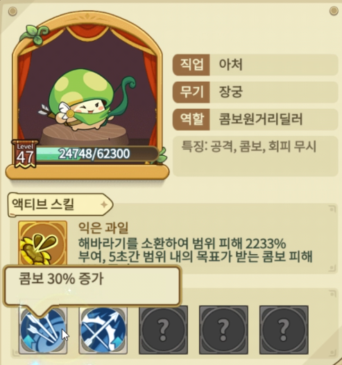 초반에 사용하면 좋은 직업으로 공격속도와 콤보에 특화되어 있습니다. 기본 콤보 30% 증가에 공속 증가까지 패시브로 가지고 있습니다. 아처는 공격속도 증가가 가장 중요하며 콤보 속성과 시너지가 좋습니다.