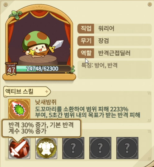 워리어로 전직하면 그즉시 반격30% 증가 버프를 얻을 수 있습니다. 또한 방어력도 올라가기 때문에 체력을 올려줄수록 더욱 강해지는 직업입니다. 스킬이나 동료 버프도 체력회복 및 반격으로 세팅해주시면 좋습니다.