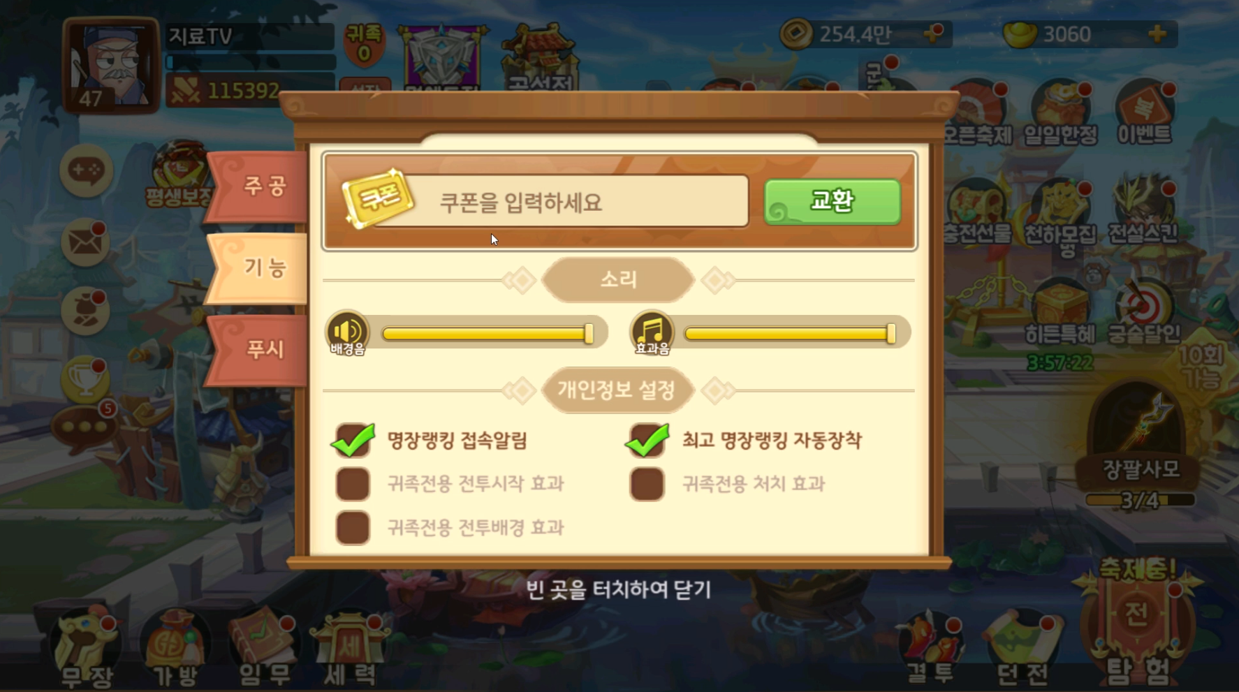 2. 주공 아래에 있는 기능 버튼을 누르면 쿠폰을 입력할 수있는 화면이 나옵니다. 이곳에 코드를 작성하고 교환 버튼을 누르면 우편함으로 보상이 들어갑니다.