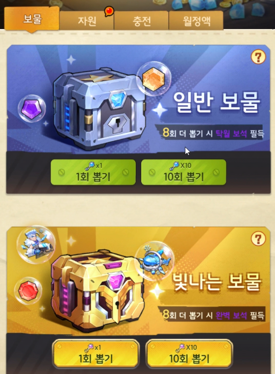 보물 상자는 10회 뽑기시 확정으로 보라색 보석을 얻을 수 있습니다.
