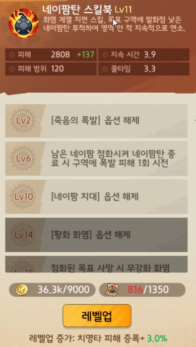 화염 계열 지면스킬로 적에게 엄청난 범위 피해를 주는 스킬입니다. 공격 사거리가 짧지만 쿨타임이 빨라서 적들이 성벽에 많이 모였을때 처리하기 좋은 스킬입니다. 가장 치명적인 단점은 공중 적은 공격하지 못한다는 것입니다.