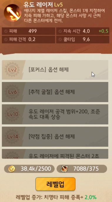 에너지 계열 레이저 스킬로 단일 타켓 공격에 특화된 스킬입니다. 1~3번째 스킬은 전부 범위에 특화되어 있기 때문에 단일 딜에 강한 이 스킬도 함께 사용해주면 좋습니다.